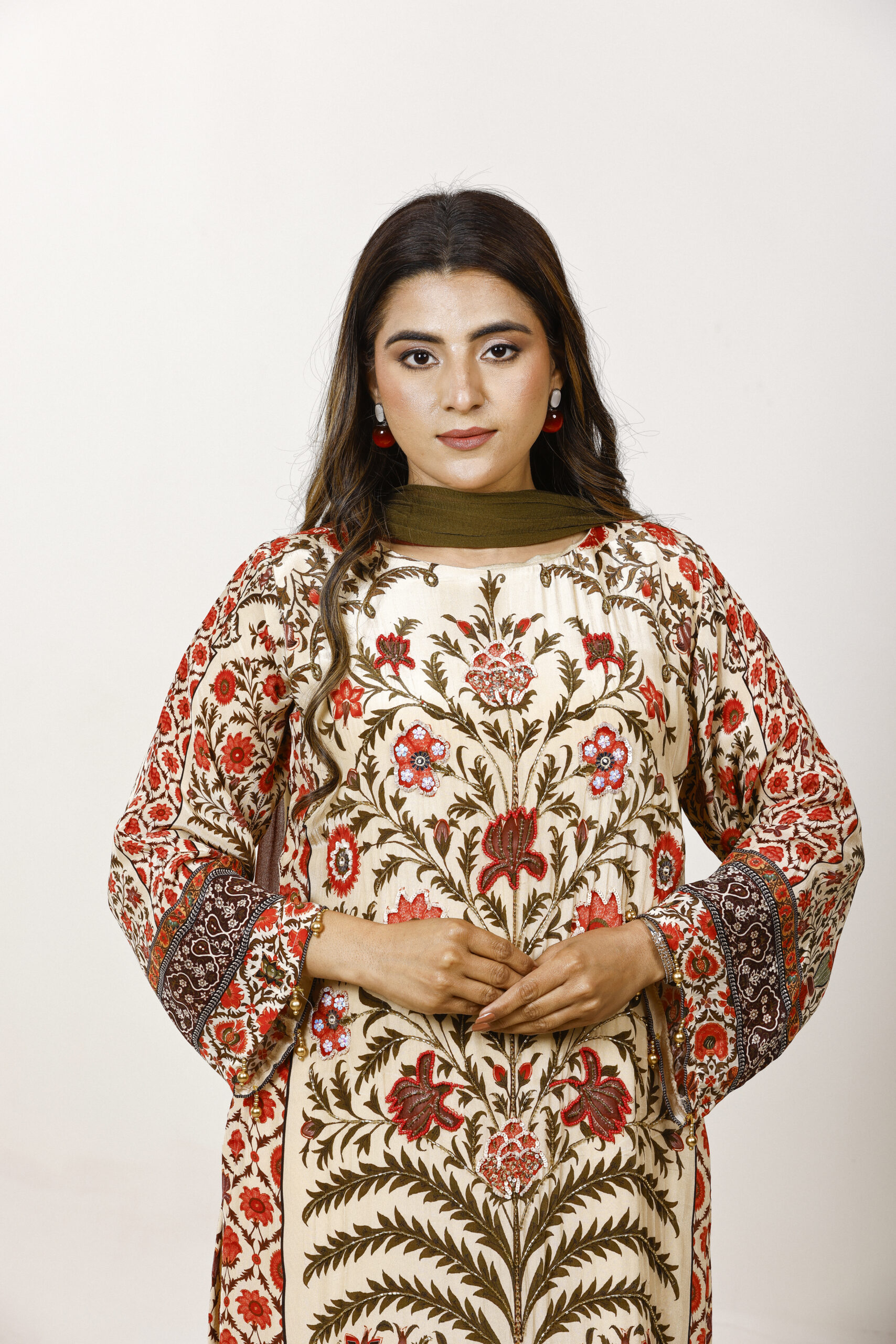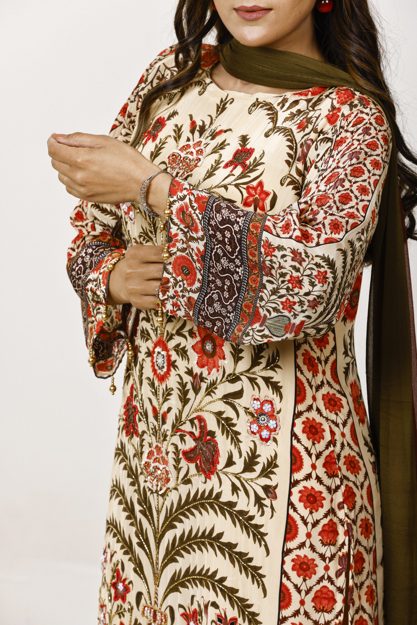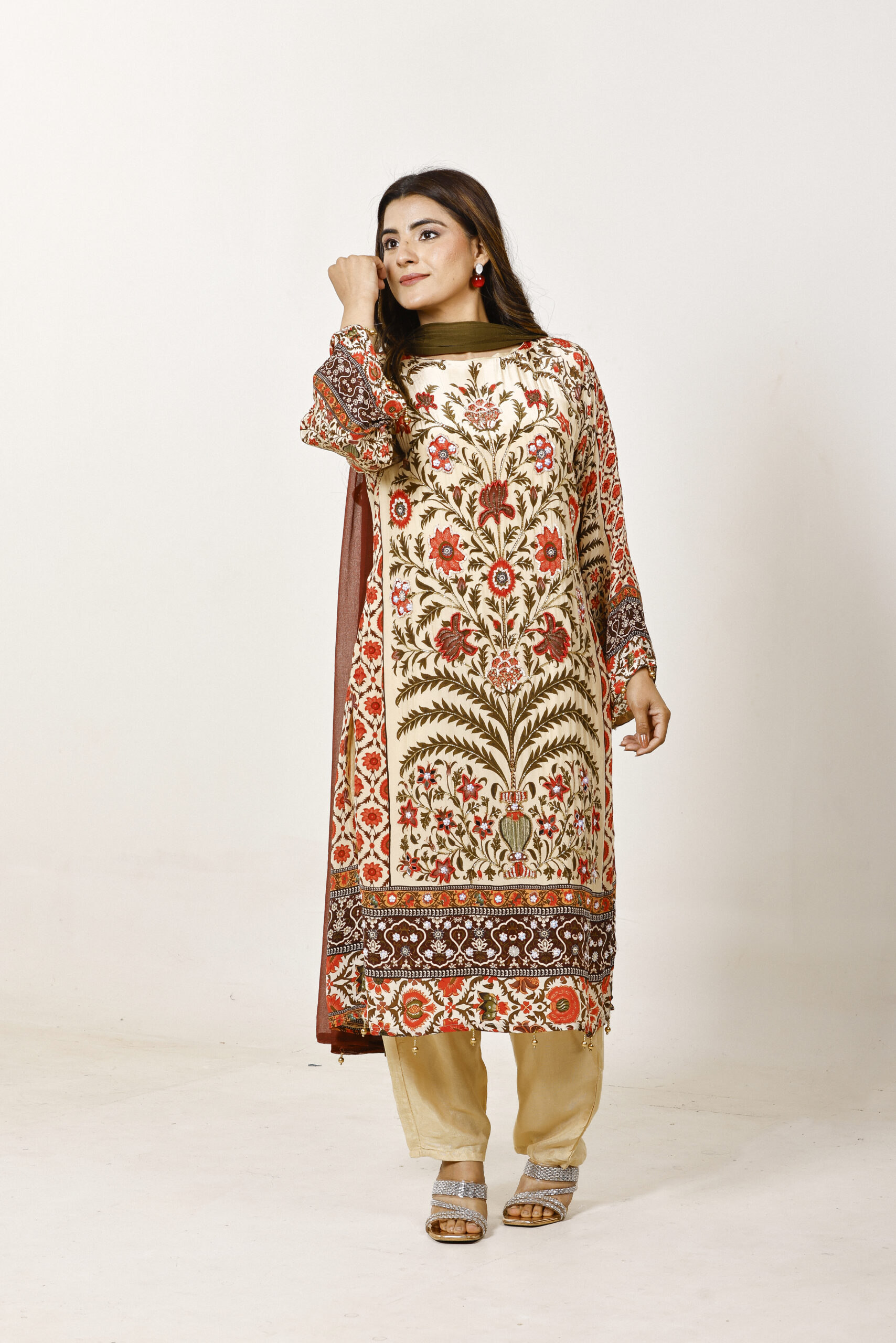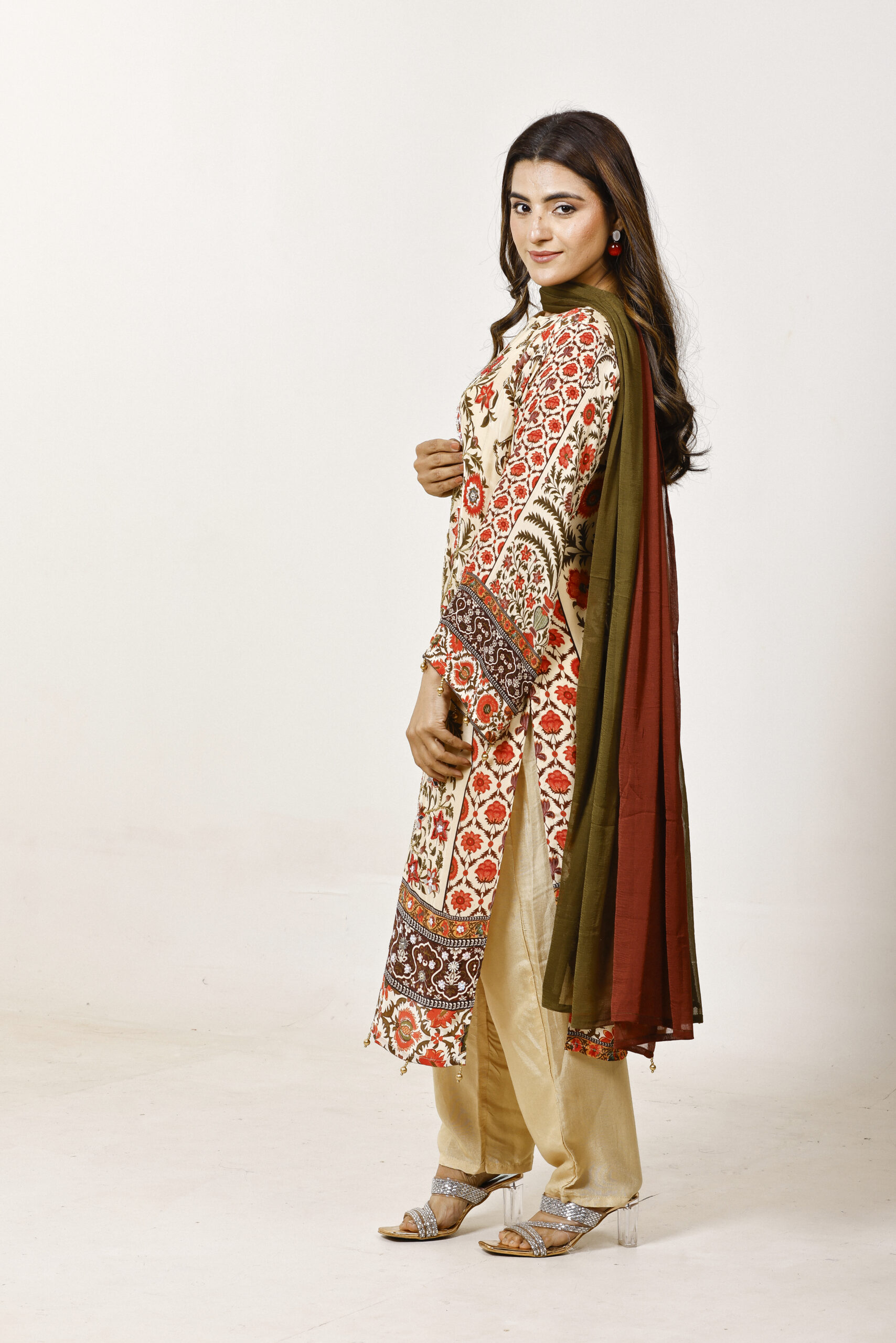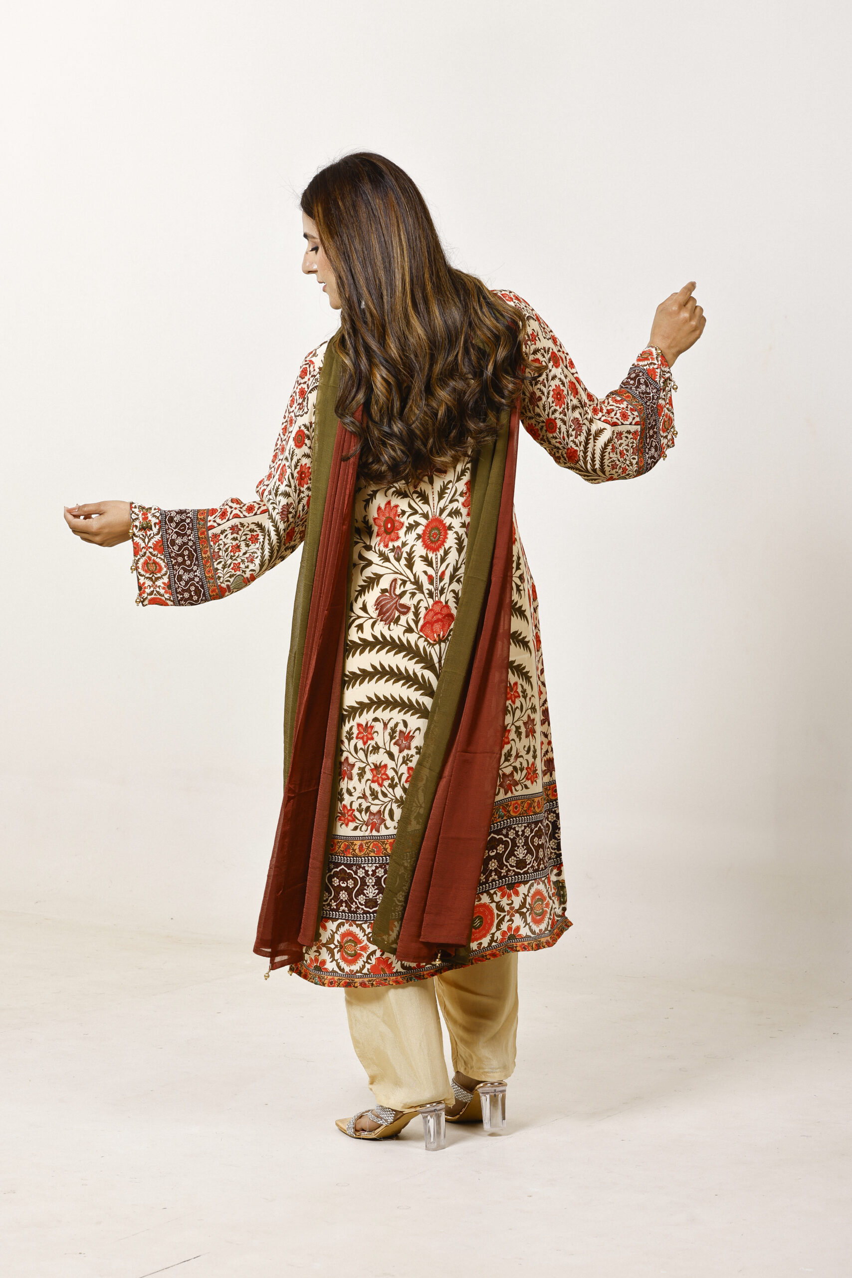A celebration of heritage florals, this curation is rendered in a warm beige palette adorned with intricate, nature-inspired prints in earthy reds and olive tones. The straight kurta is paired with softly tailored pants, while a dual-toned dupatta adds depth and contrast.